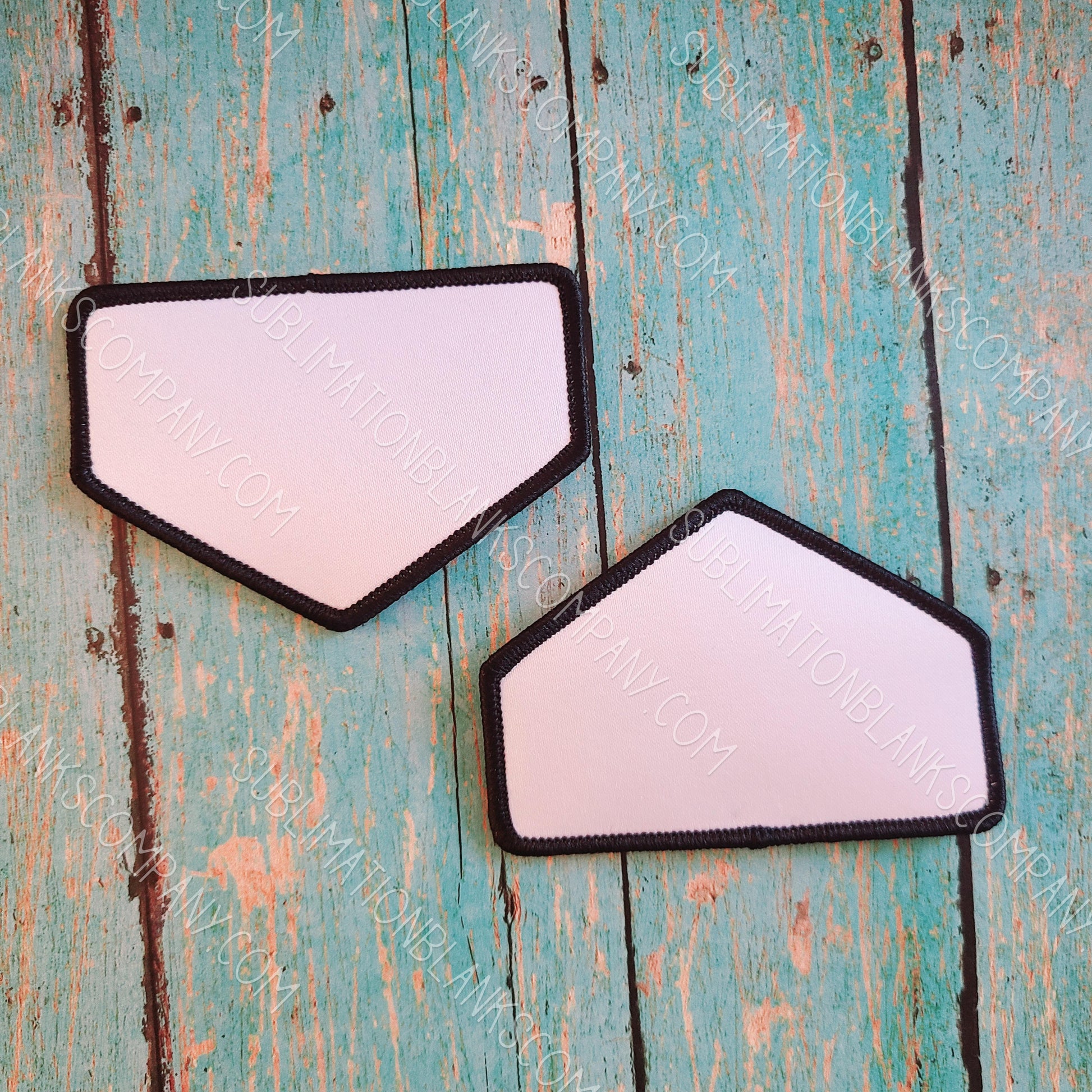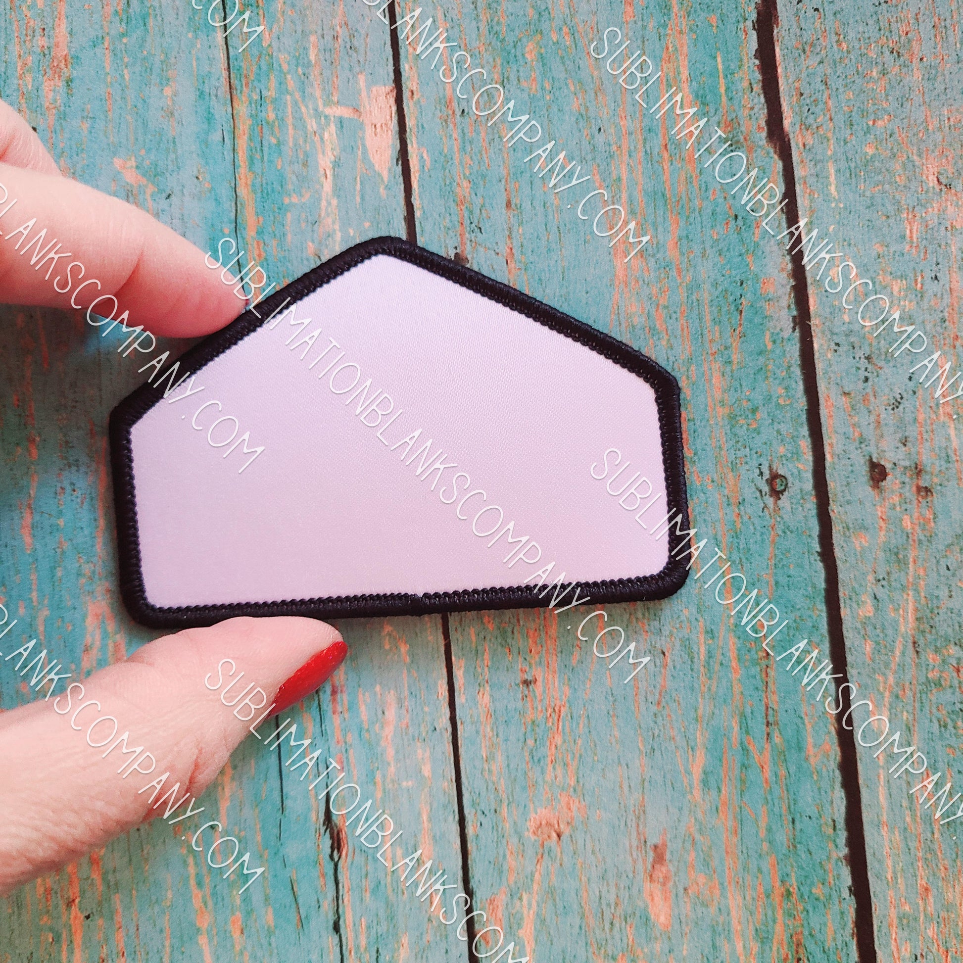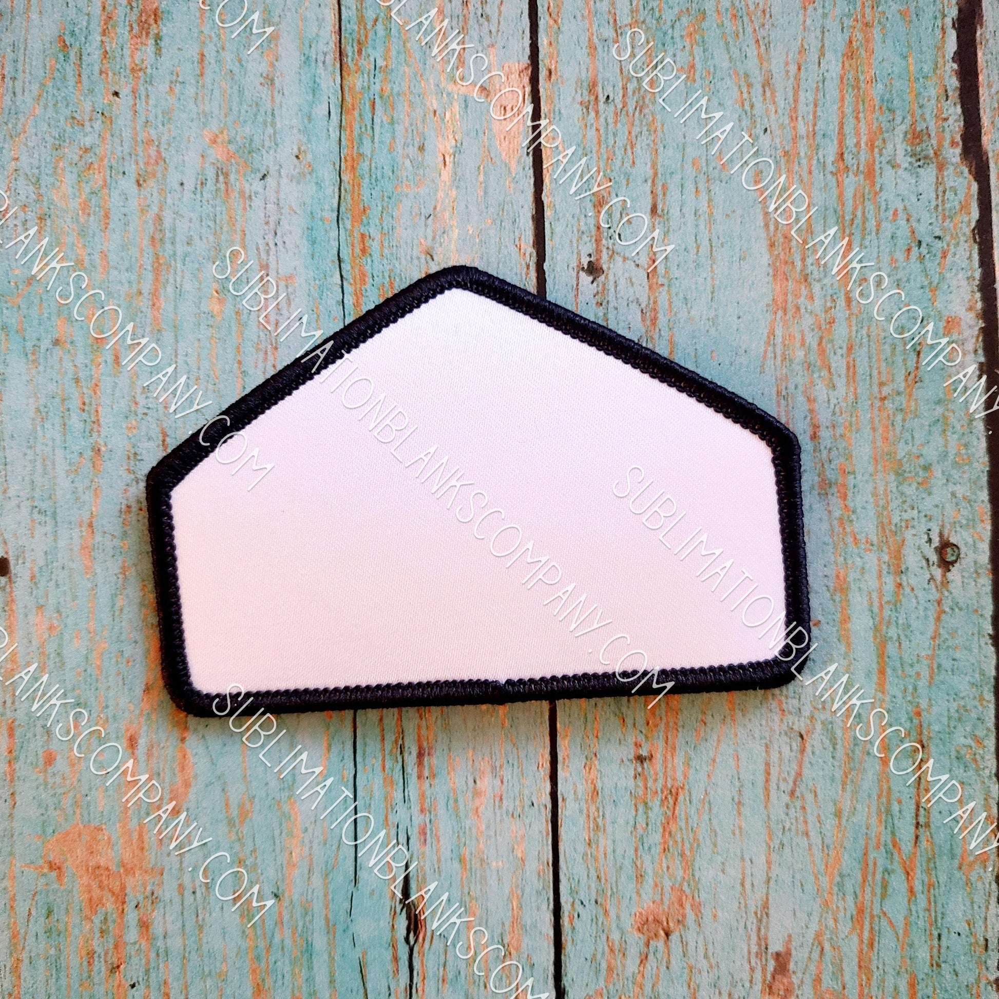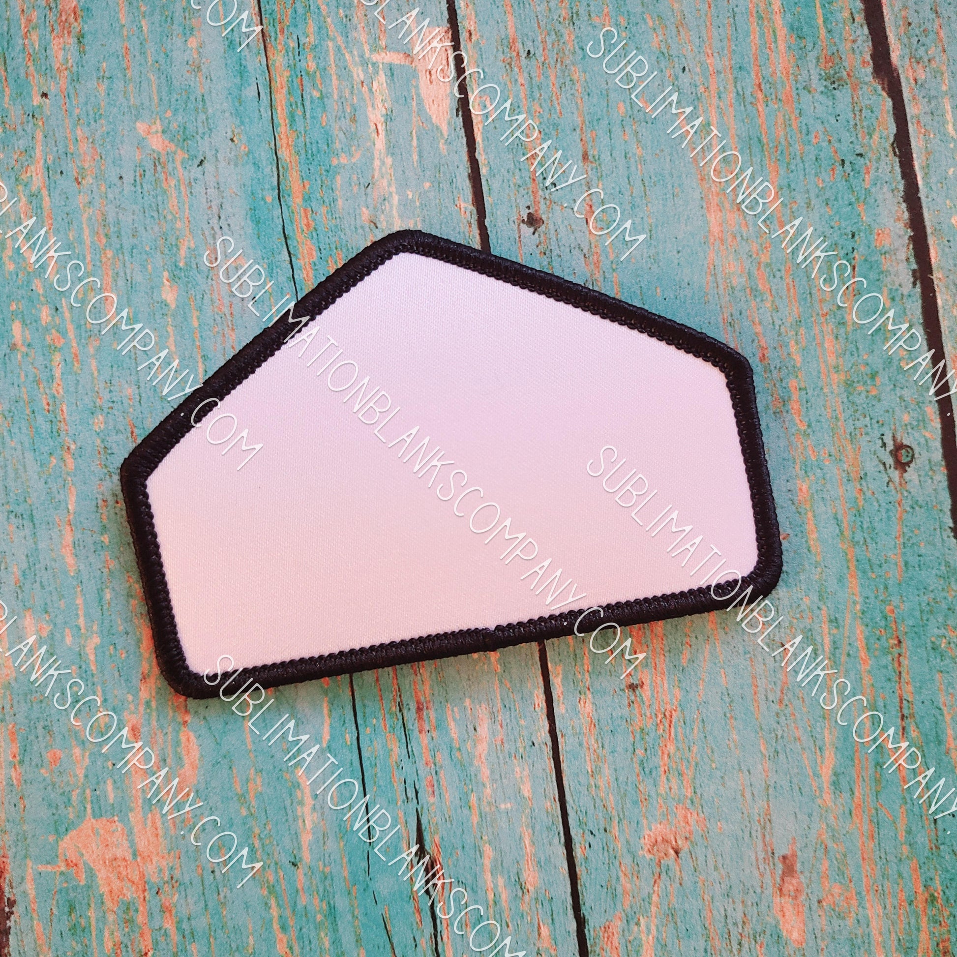 Our Half Diamond Rectangle Shape Hat Patch Sublimation Blank with black stitching all around is a unusual way to add a bit of cool factor to any hat or jacket. Ours has glue paper on the back side which heats up for you to attach to your hat or garment. Super! Our inverted hat patches are sublimation ready!