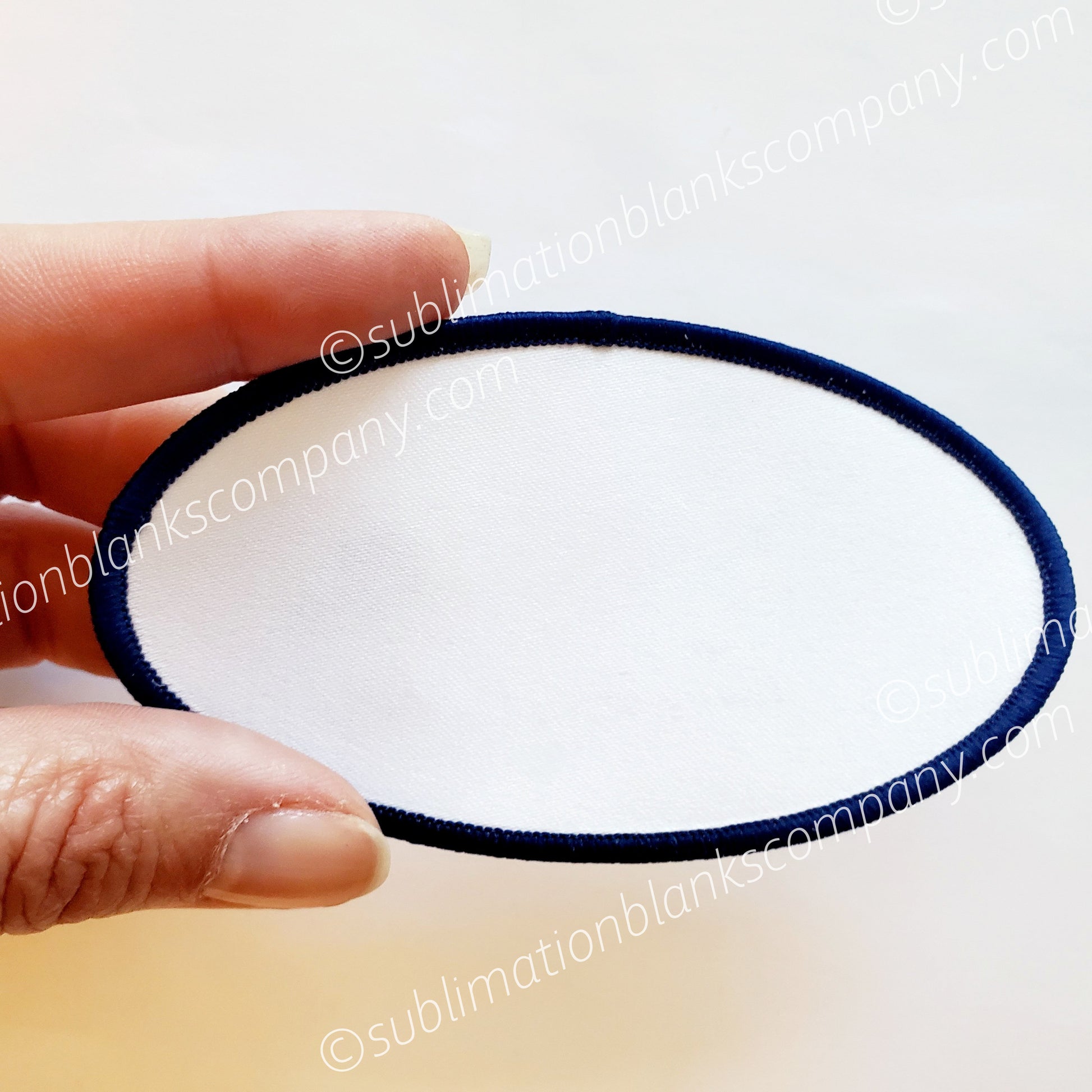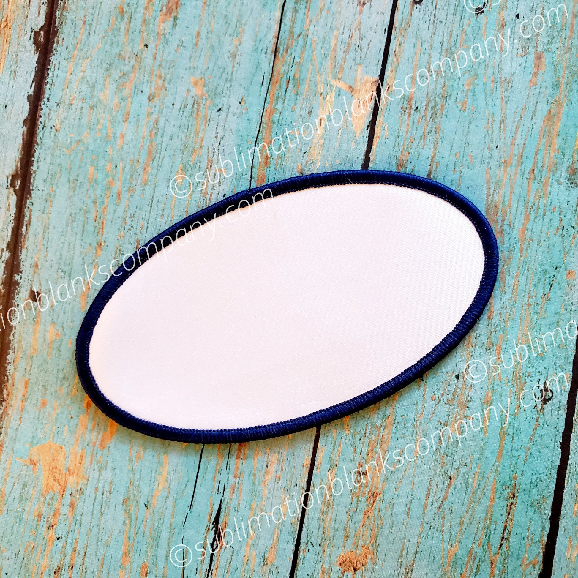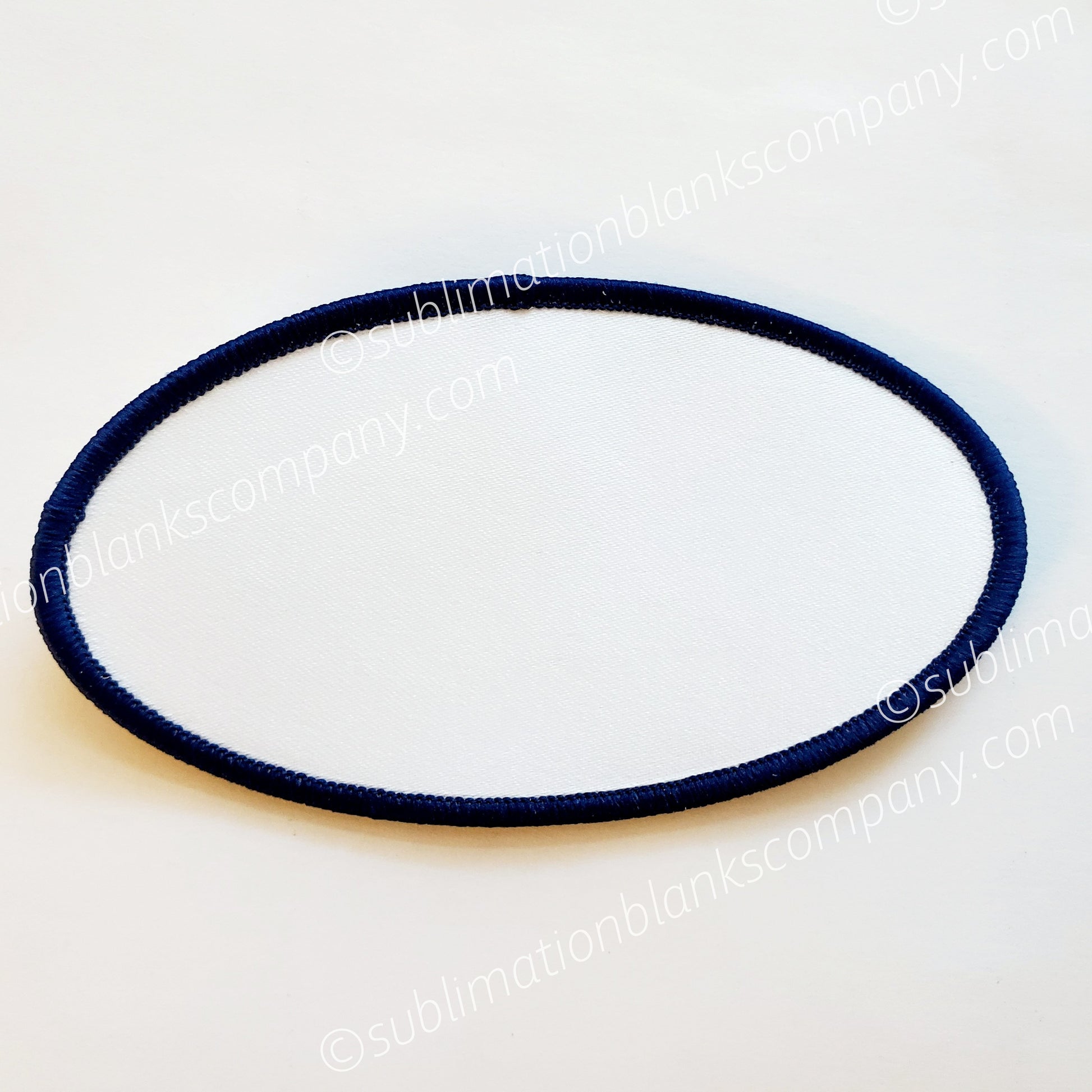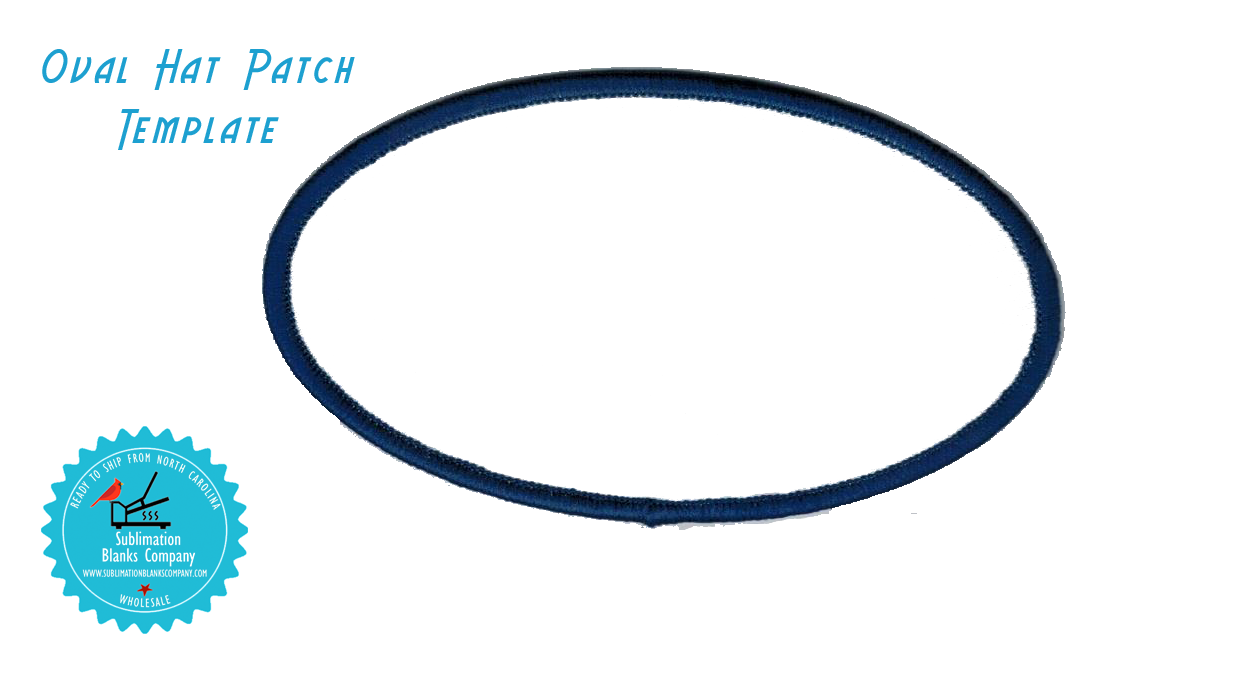 Cool Oval Shape Hat Patch Sublimation Blank with navy blue stitching all around is a terrific way to jazz up any hat or jacket. Ours have glue paper on the back side which heats up for you to attach to your hat or garment. Nifty! Our oval hat patches are sublimation ready!