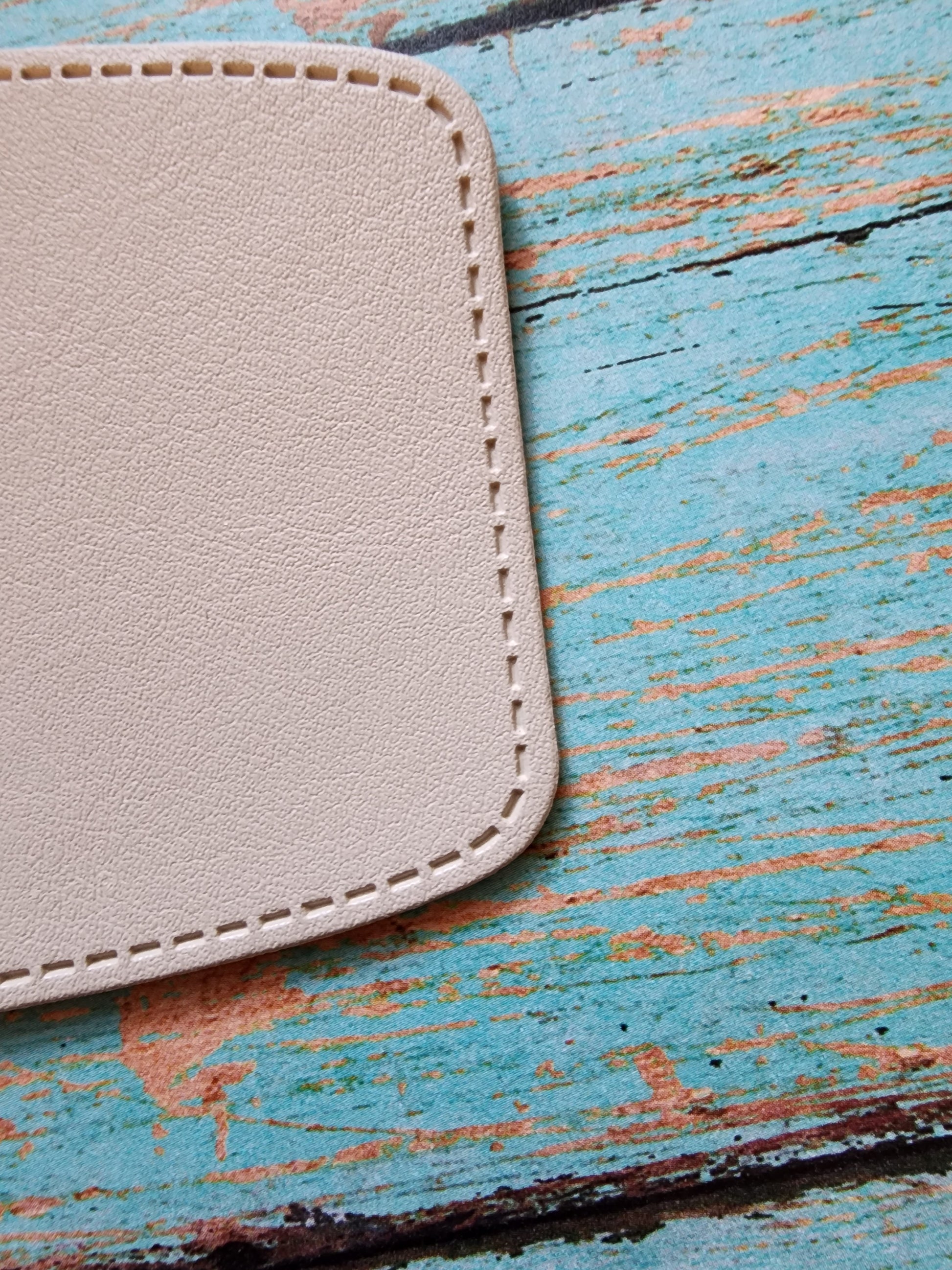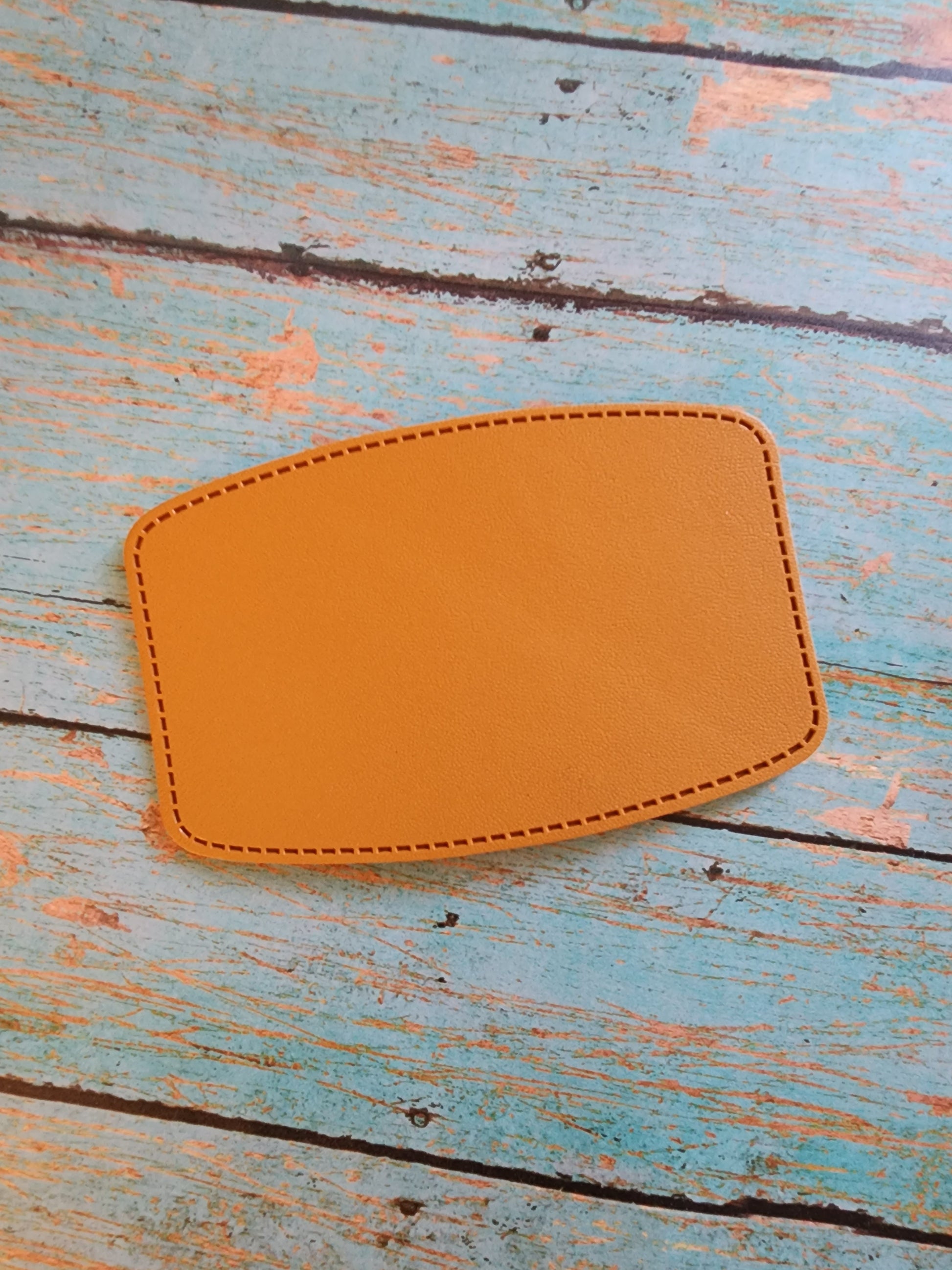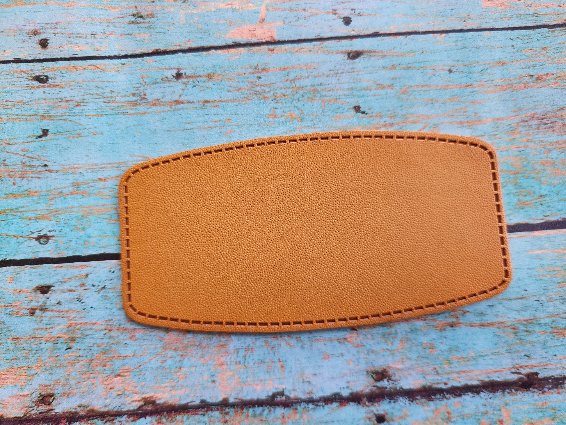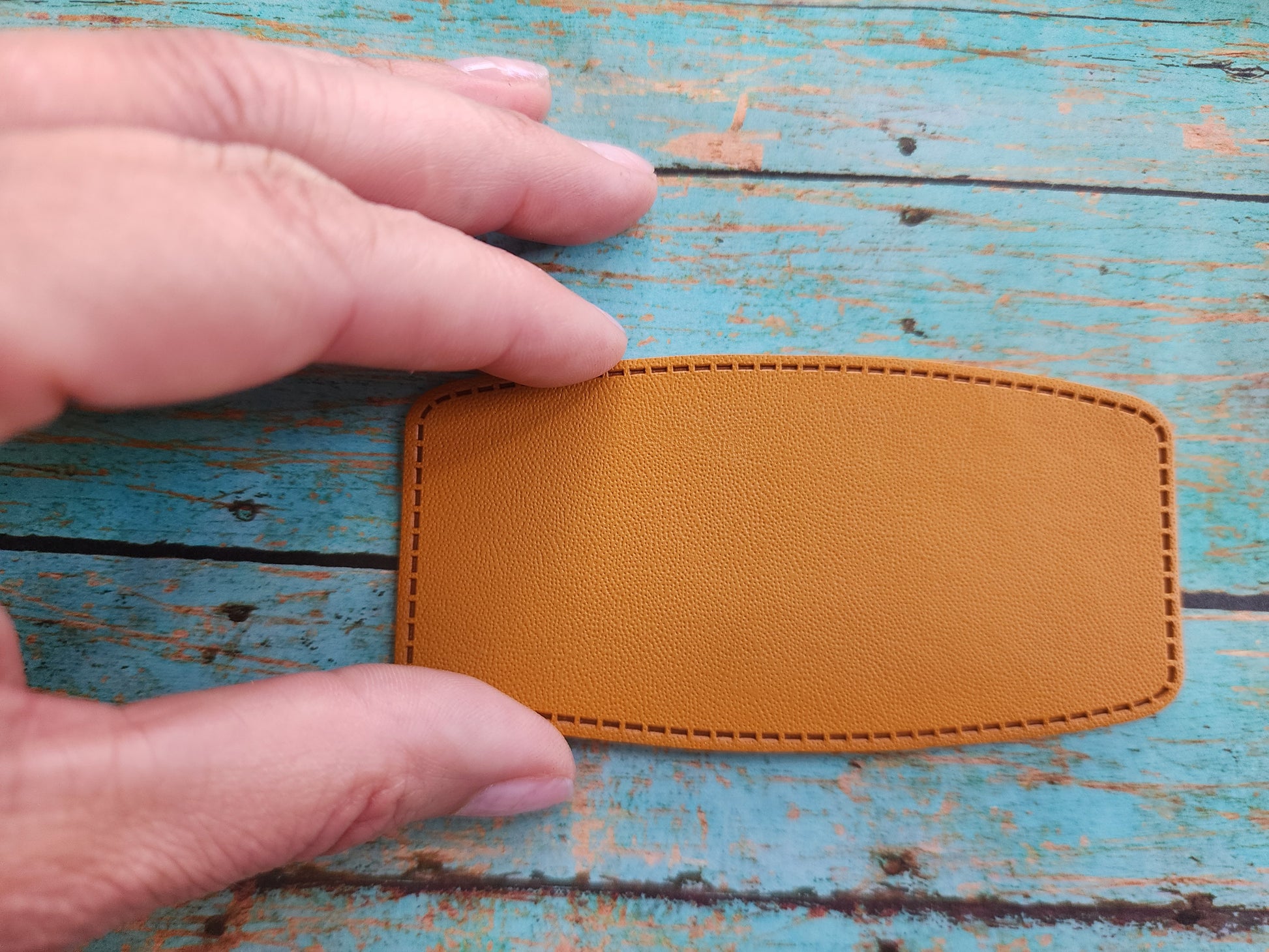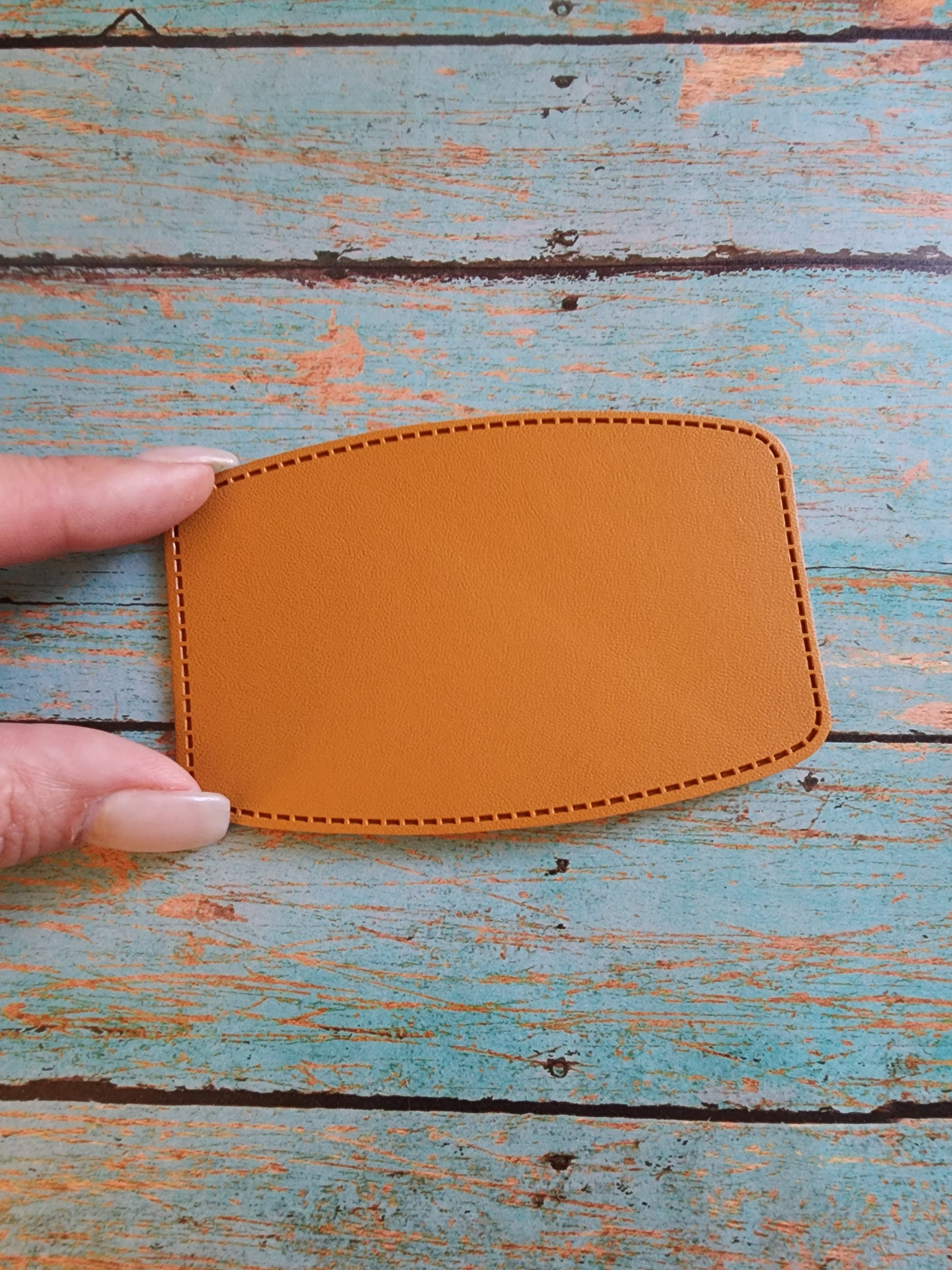 - Made of faux leatherette rounded edge rectangle that is easy to sublimate or laser/laserable